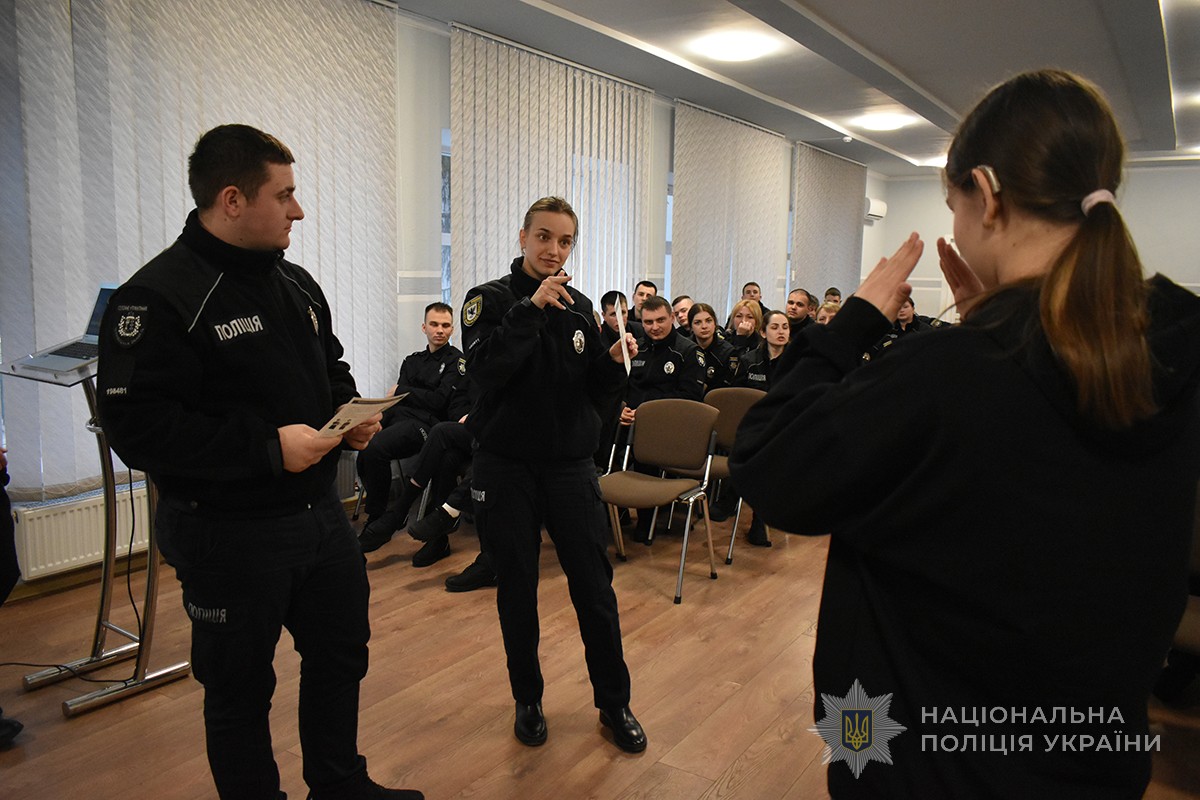 Слухачі дізнались про особливості жестомовного спілкування, познайомились із дактильною абеткою, потренувались у розумінні жестової мови і відтворенні нею власних імен. Для глибшого знайомства з особливим напрямком спілкування правоохоронцям було рекомендовано жестівники та онлайн додаток для вивчення жестової мови «Spread the sign». Також були розглянуті можливості сприйняття контенту на офіційних електронних інформаційних ресурсах та виклику перекладача, зокрема, й на сайті Національної поліції України.
