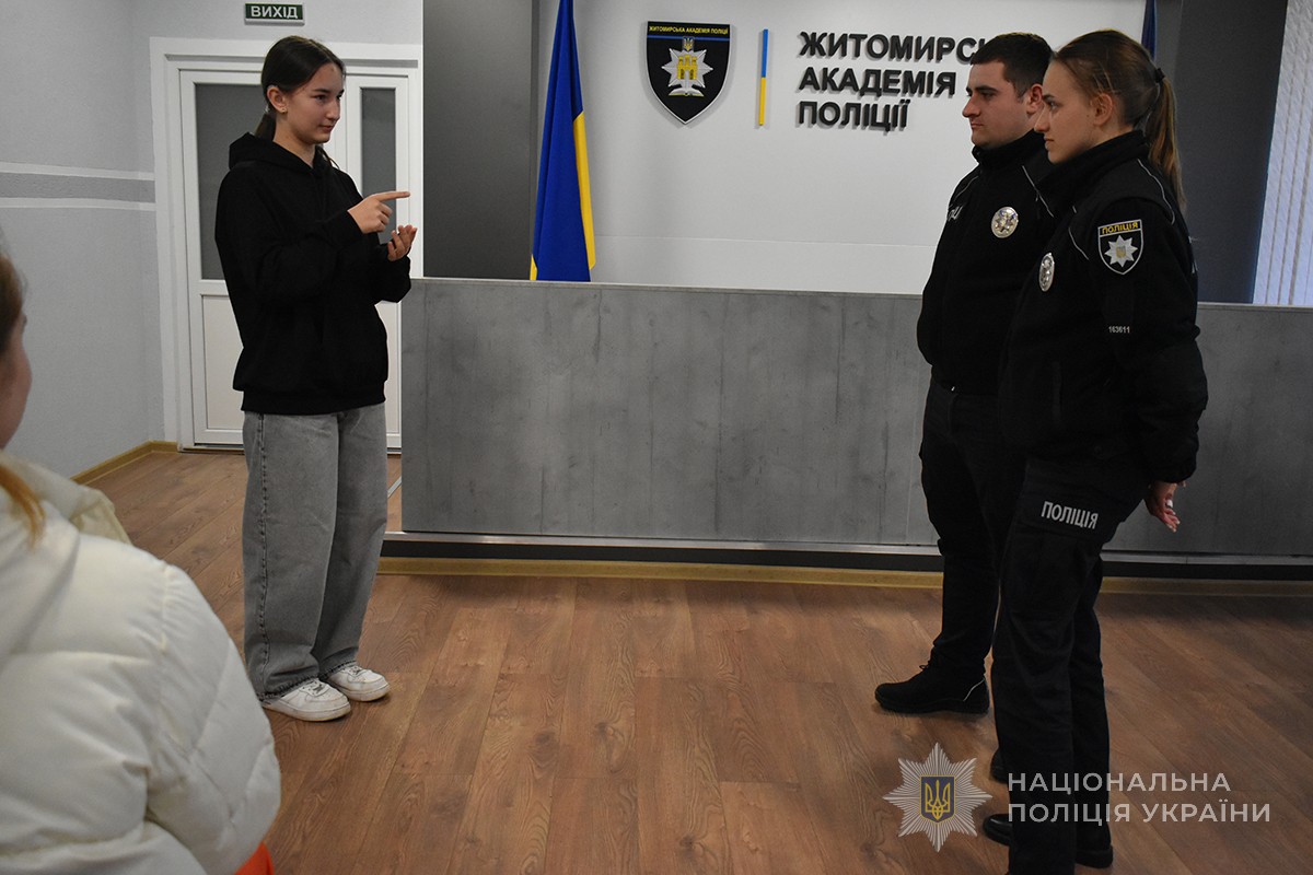 Слухачі поліцейської академії у Житомирі продовжують практику вивчення окремих аспектів роботи правоохоронців з людьми, які мають порушення слуху. Такі ознайомчі заняття проводяться за сприяння Громадської організації «Капеланський патруль» і волонтерів проєкту у рамках Національної стратегії створення безбар’єрного простору.