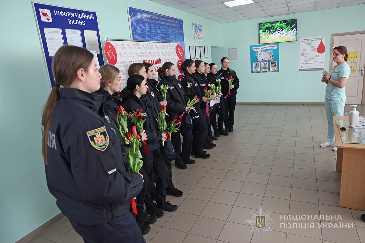 Справді приємним сюрпризом від центру крові стали весняні бонуси – букети жінкам-поліцейським.