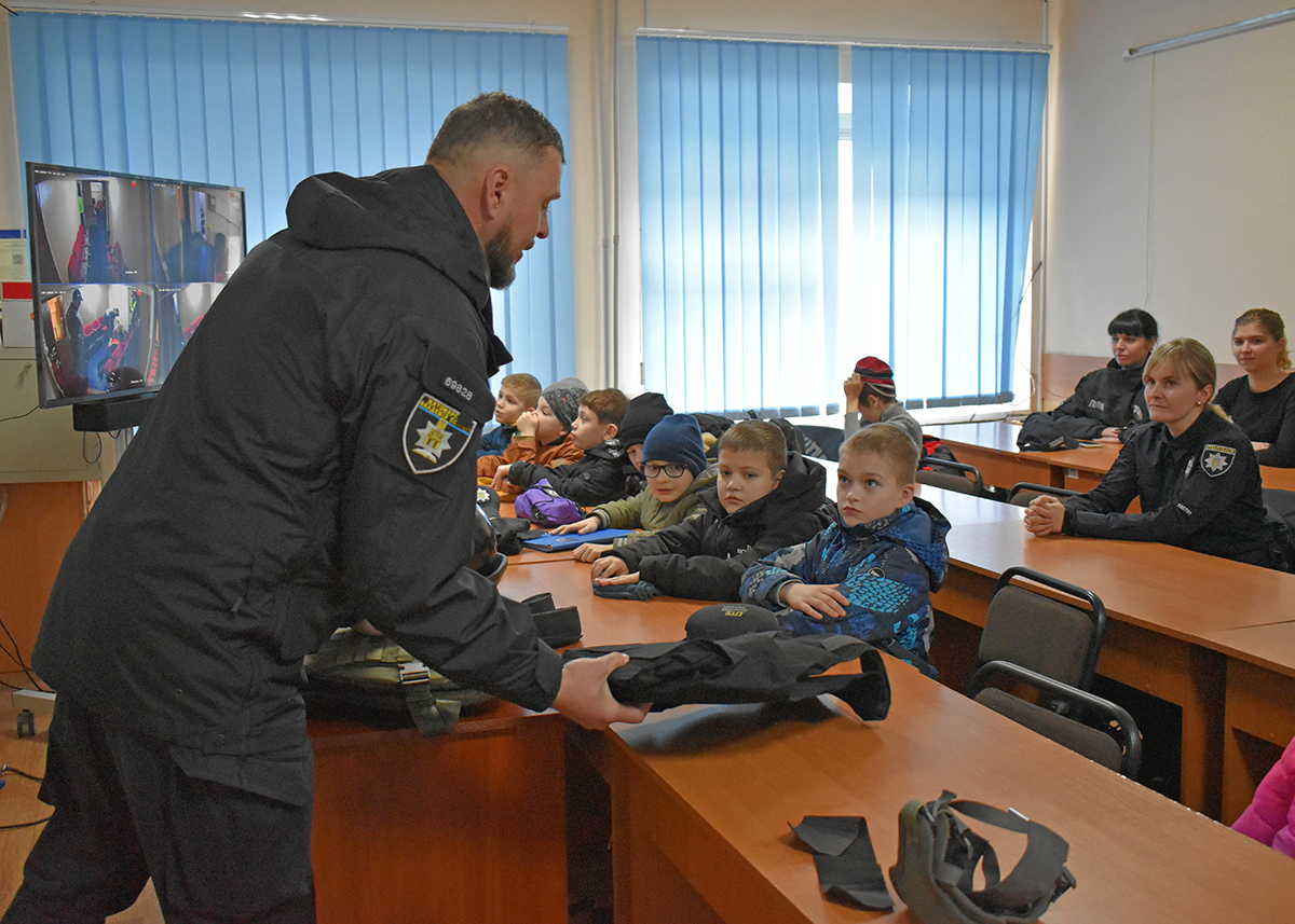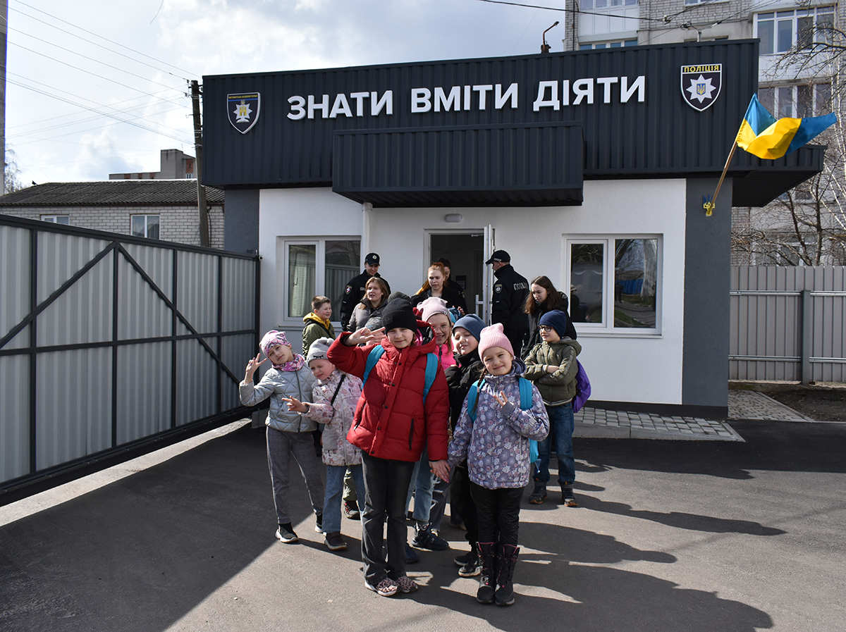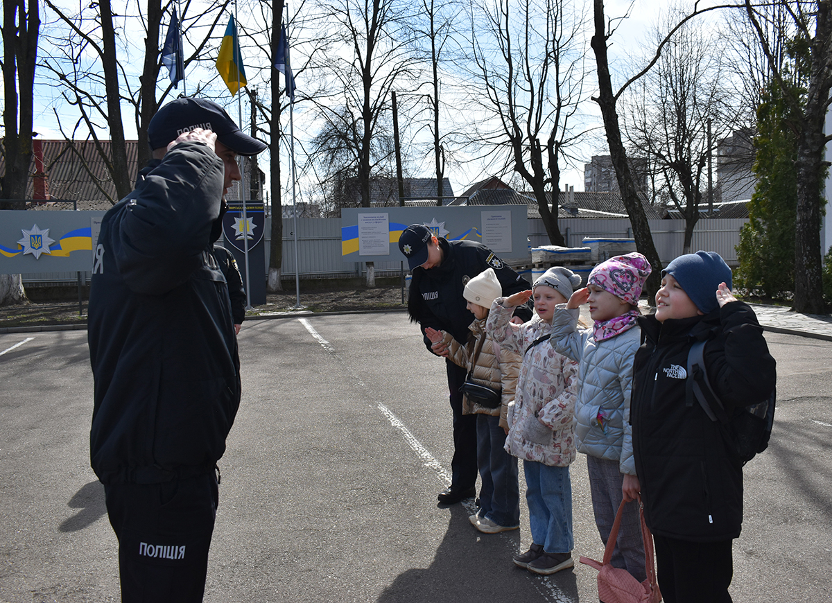 Маленьких відвідувачів зустріли старший психолог закладу та слухачі. Дітям розповіли, яким важливим професіям навчають у поліцейській академії. Також пояснили значення гасла «Знати! Вміти! Діяти!»
