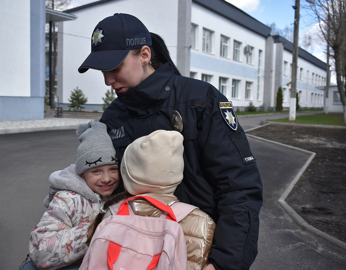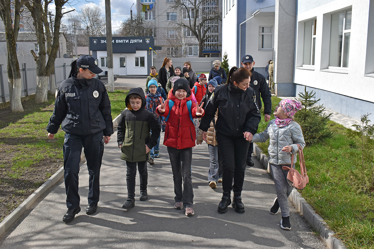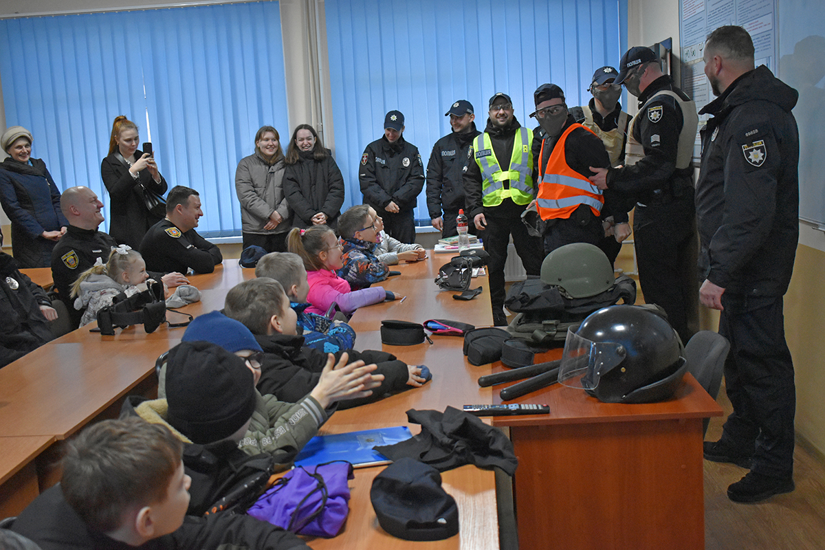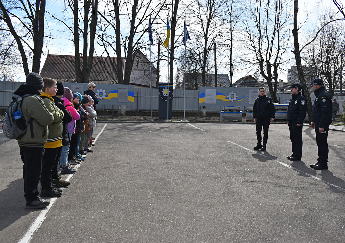 Маленьких відвідувачів зустріли старший психолог закладу та слухачі. Дітям розповіли, яким важливим професіям навчають у поліцейській академії. Також пояснили значення гасла «Знати! Вміти! Діяти!»