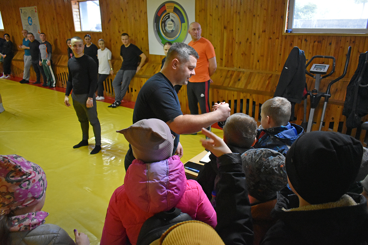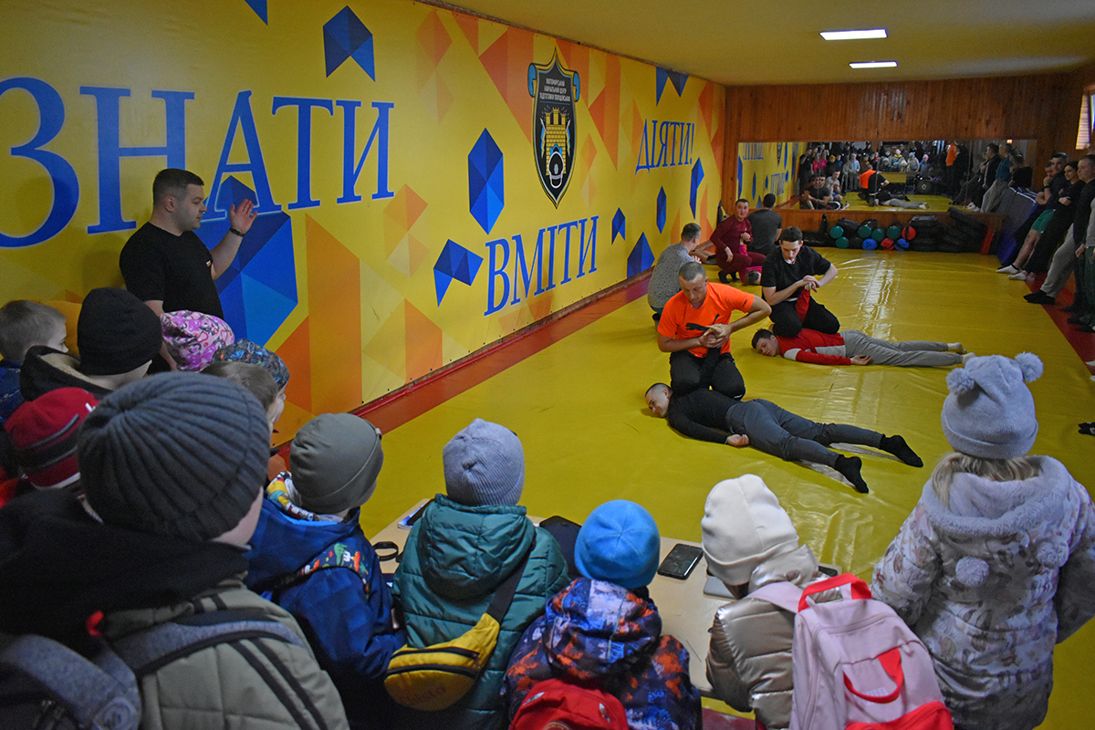 У свою чергу, викладач Дмитро Саватєєв показав, як поліцейські тренуються в опануванні навичок самозахисту і прийомів затримання.