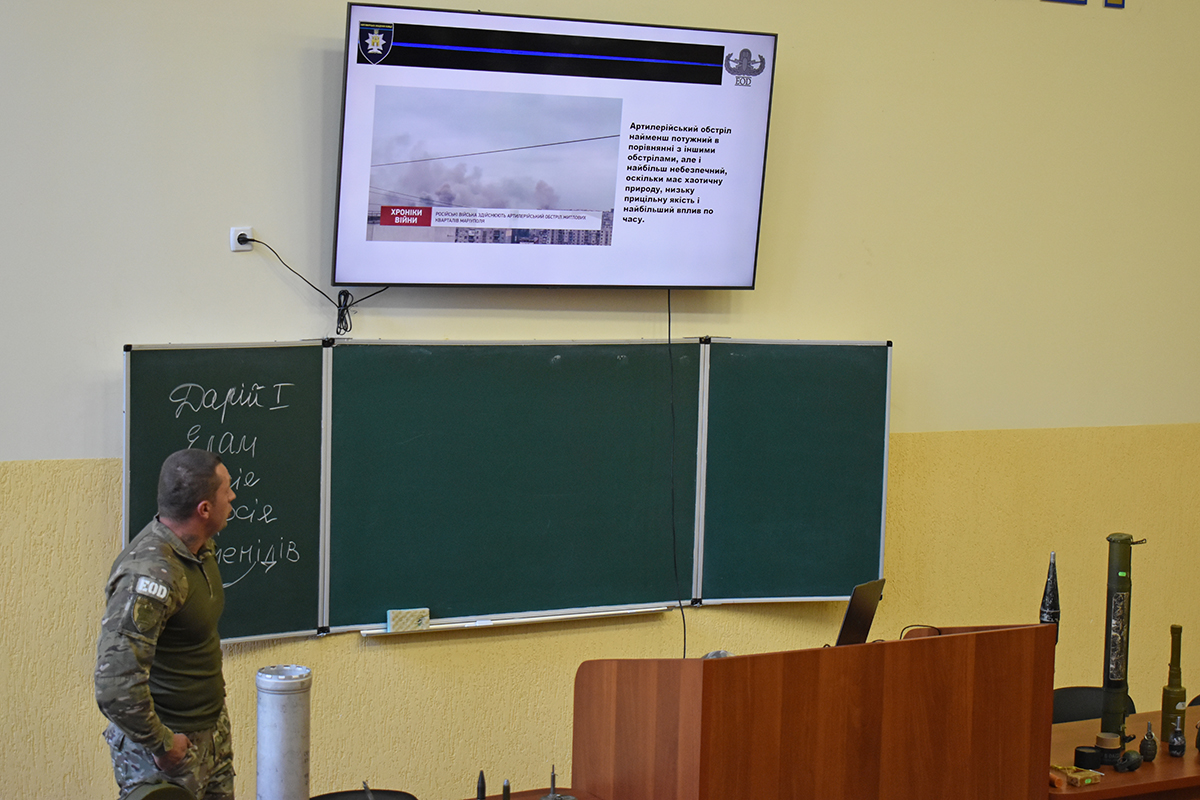 Молоді продемонстрували макети боєприпасів, які становлять загрозу здоров’ю і життю людей. Окремо викладач-вибухотехнік наголосив на алгоритмі дій під час виявлення підозрілих і потенційно небезпечних предметів у публічних місцях населених пунктів чи за їх межами.
