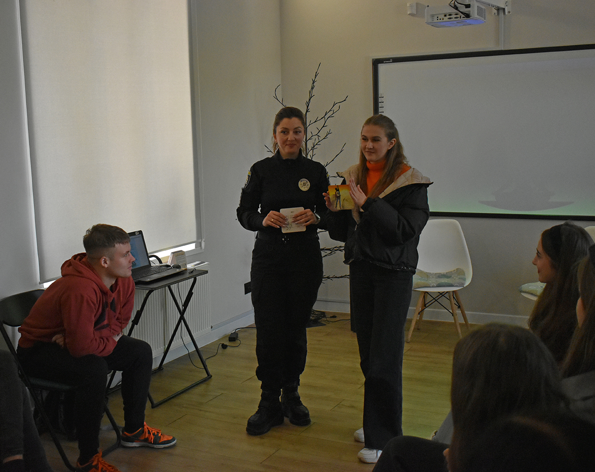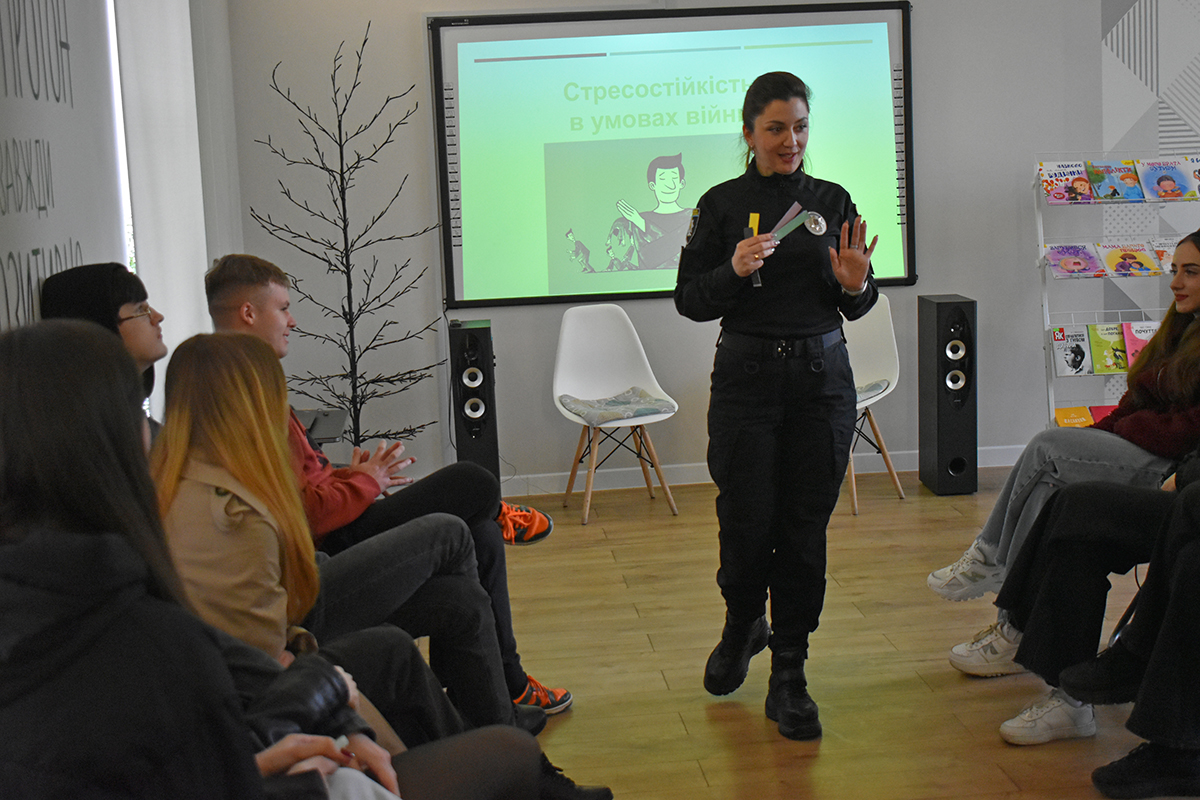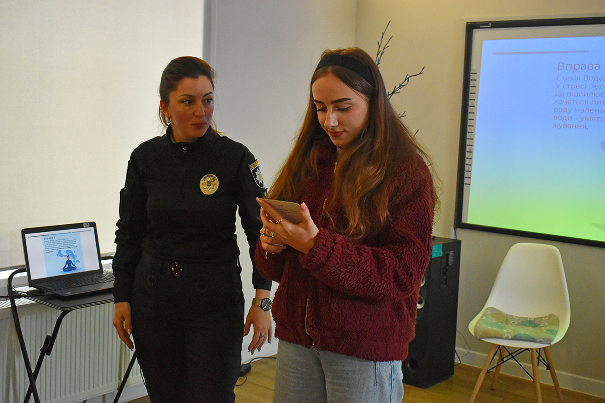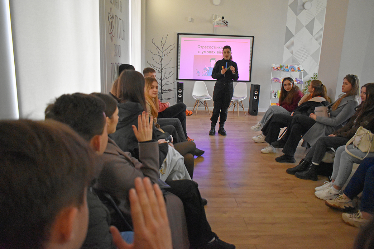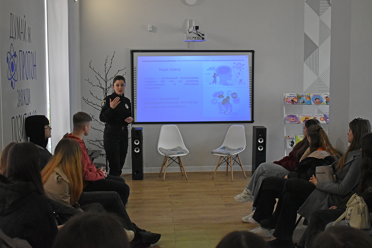 Тематична зустріч студентів з поліцейським психологом відбулася у молодіжному просторі та стосувалась ефективних методик саморегуляції, подолання негативних емоцій і почуттів та стресостійкості в умовах війни.