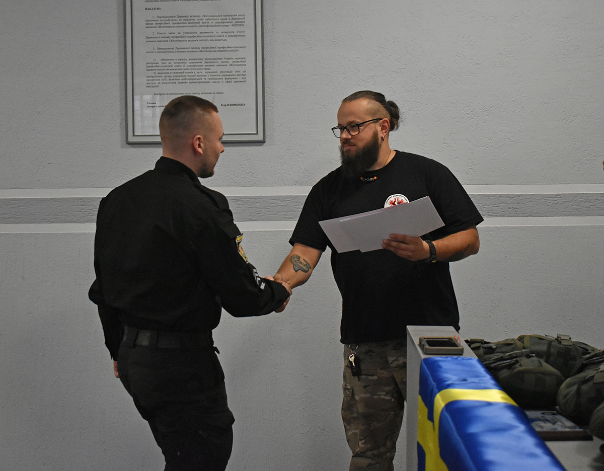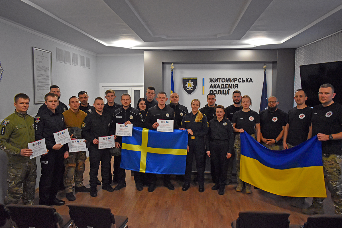 Профільні навчання з курсу тактичної медицини тривали впродовж тижня на базі Житомирської академії поліції. Під керівництвом фахових інструкторів і бойових медиків правоохоронці удосконалили знання та відпрацювали навички надання долікарської допомоги. Підвели підсумки та вручили сертифікати учасникам в академії у присутності міжнародних партнерів.