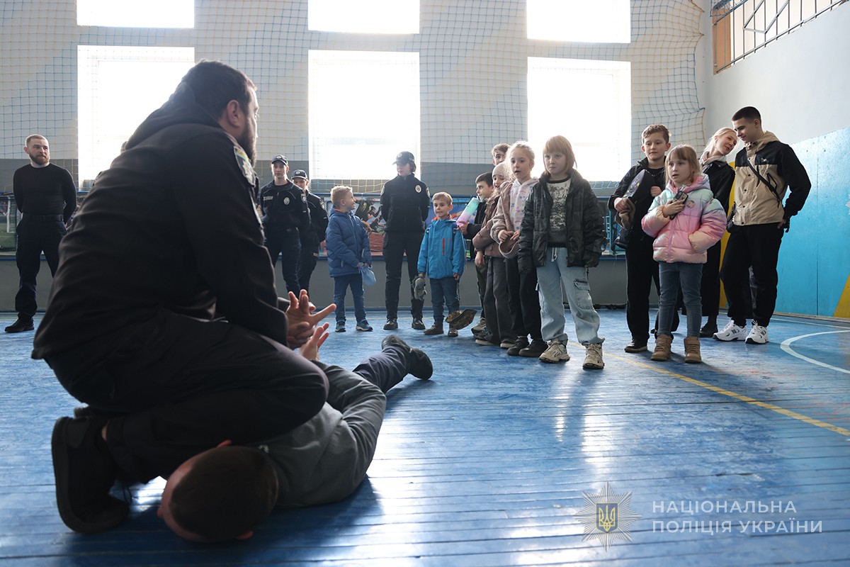У спортивній залі програма продовжилася заняттями з основ самозахисту. Викладачі продемонстрували юним гостям прийоми самозахисту за навчальною програмою правоохоронців.