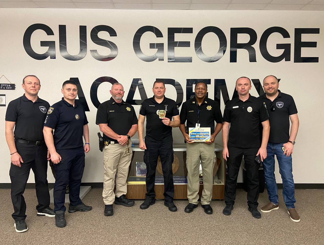 На завершення зустрічі поліцейські вручили американським колегам прапор України та національні сувеніри. Зокрема, Максим Каптенко передав закладу «Gus George Law Enforcement Academy» пам’ятний коїн Житомирської академії поліції.