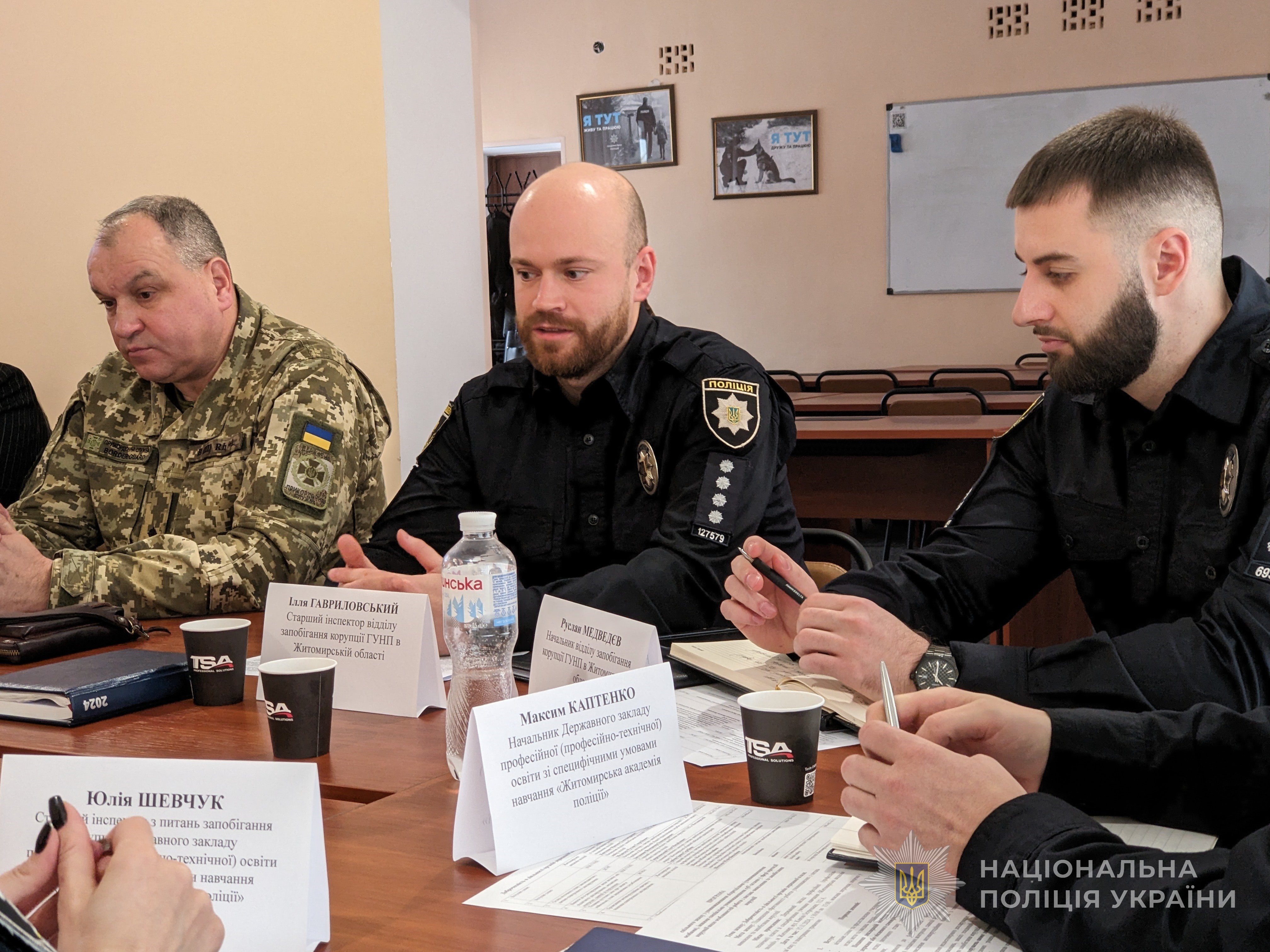 – Ми, як навчальний заклад, що здійснює первинну підготовку поліцейських, зацікавлені в участі в таких зустрічах. Адже фахівчиня з протидії корупції з нашими слухачами і з постійним особовим складом проводить необхідну роз’яснювальну і консультативну роботу. Тому тут важливий і комунікативний зв'язок з колегами у цій сфері. Спільна робота об’єднує і дає можливості почерпнути нові знання для забезпечення принципу законності в нашій діяльності, - підсумував зустріч начальник Житомирської академії поліції Максим Каптенко.