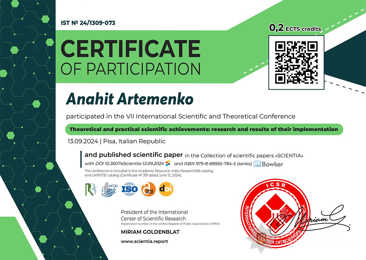 Нещодавно в італійському періодичному виданні «Sientia» була опублікована наукова стаття авторства української поліцейської Анаіт Артементко «Права дітей в умовах воєнного конфлікту». Робота містить не лише констатацію фактів і порівняльні відомості закордонного досвіду, але й пропозиції щодо застосування нових підходів у розв’язанні тих чи інших проблем.